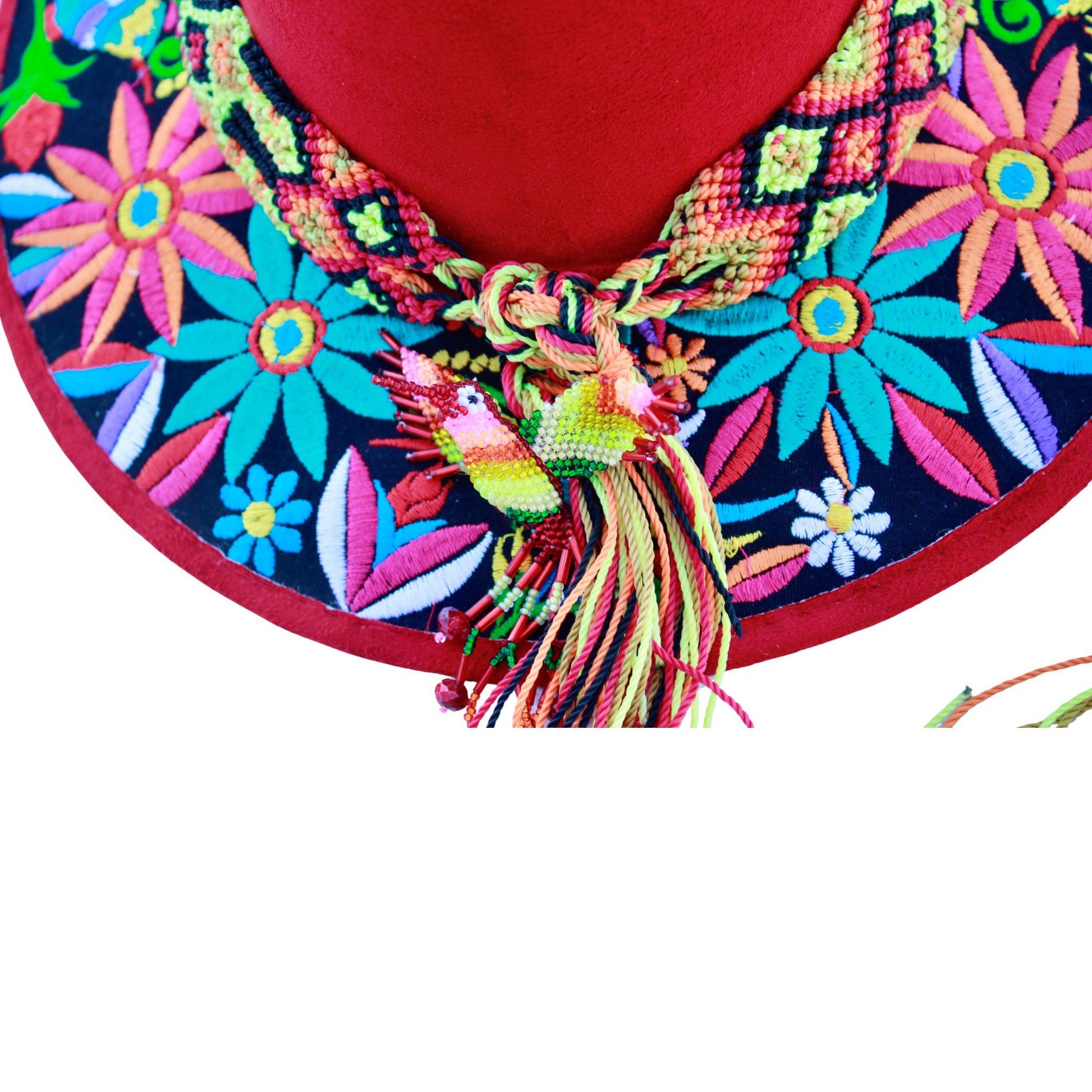 Red floral hat with tan bag